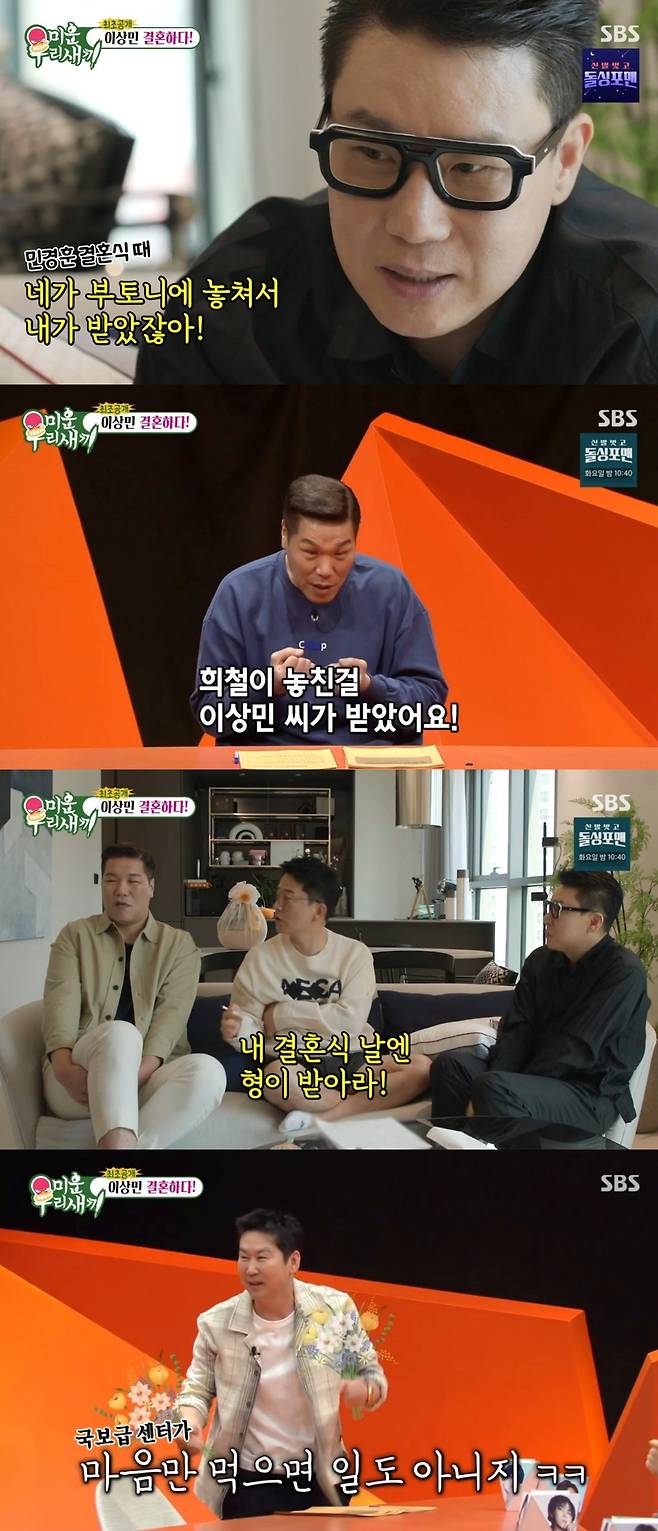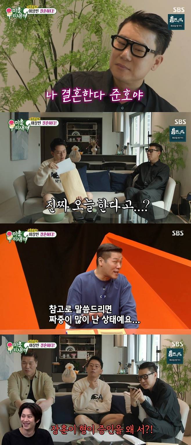 11일 방송된 SBS '미운 우리 새끼'에서는 최근 비연예인 여성과 재혼한 이상민이 혼인신고 증인을 위해 서장훈과 김준호를 만난 장면이 전파를 탔다.