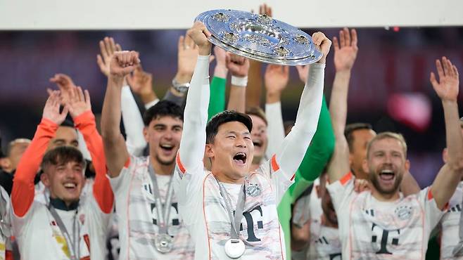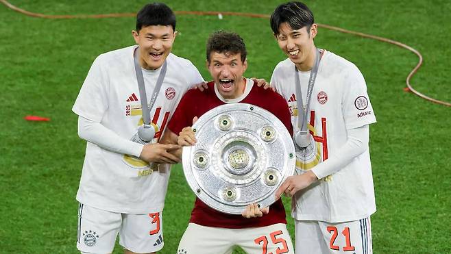 다소 수줍은 표정이었던 김민재는 처음엔 손사래를 쳤지만, 팀 동료들의 재촉에 결국 앞으로 나왔다. 뮐러가 그의 어깨를 감싸며 트로피를 가리켰고, 곧이어 김민재는 마이스터샬레를 두 손으로 들어올렸다.