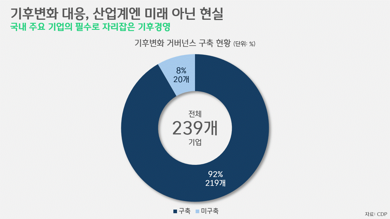 CDP(Carbon Disclosure Project, 탄소정보공개프로젝트)가 국내 기업을 대상으로 실시한 조사 결과, 조사 대상 239개 기업 중 기후변화 거버넌스를 구축했다고 응답한 기업이 92%에 달하는 것으로 나타났습니다. 다만, 이 거버넌스의 실질적인 운영을 가능케 하는 '전문성'에 있어선 부족함이 엿보였습니다. 기후변화 거버넌스를 구축한 기업 중 52%만이 이사회나 경영진이 기후변화 전문성을 보유하고 있다고 답한 겁니다. CDP는 “글로벌 기업의 평균인 87%에 비해 현격히 낮은 수준”이라고 평가했습니다.