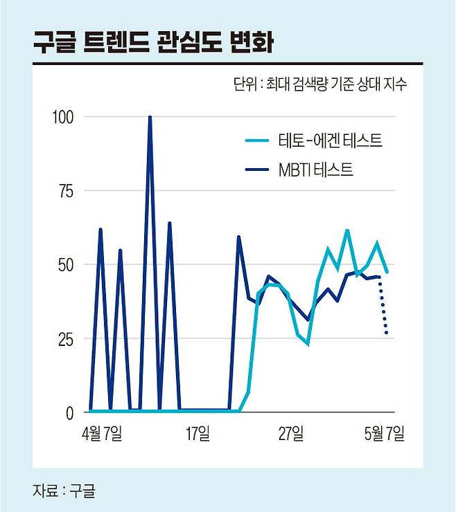 테토-에겐 이론은 2021년 네이버 블로거 ‘수성일기’가 게시한 글에서 처음 등장했다. 이후 인스타툰 작가 ‘내쪼’가 이를 웹툰 형식으로 재구성해 대중적으로 확산됐다. 구글 트렌드에 따르면 ‘에겐 테토 테스트' 키워드 검색량은 4월 24일 65를 기록한 뒤 가파르게 상승해 5월 3일 최고점인 100을 찍었다. 구글 트렌드는 검색량이 가장 많았던 시점을 100으로 기준으로 상대적 검색량을 보여준다. 검색량이 너무 적으면 0으로 표시된다. ‘에겐 테토 테스트’는 4월 30일부터 근소한 차이로 ‘MBTI 테스트’를 앞선 상태다.