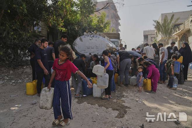 [칸유니스=AP/뉴시스] 11일(현지 시간) 가자지구 칸유니스에서 팔레스타인 피란민들이 급수 트럭에서 물을 받고 있다. 2025.05.12.