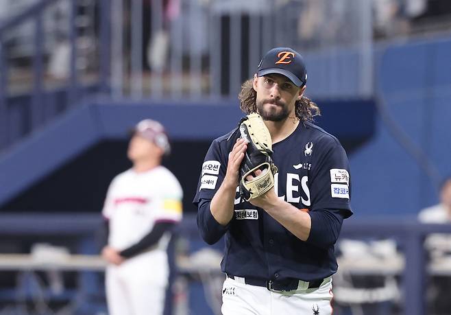 | ▲ 11일 서울 고척스카이돔에서 열린 프로야구 한화 이글스와 키움 히어로즈의 경기. 8이닝을 무실점 호투로 마친 한화 선발 와이스가 기뻐하고 있다. |