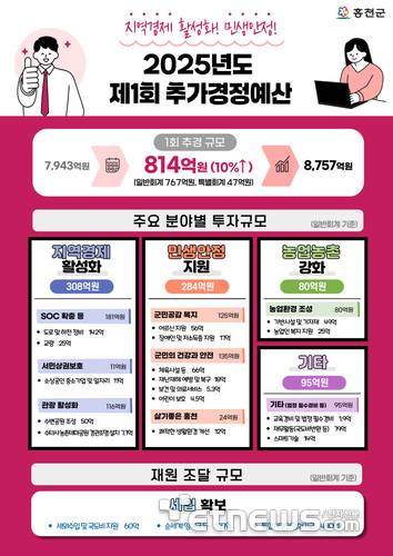 홍천군은 2025년도 제1회 추가경정예산으로 총 8757억원을 확정했다고 12일 밝혔다. 이는 본예산 7943억원 대비 814억원(10.25%) 증액된 규모다. 일반회계는 7960억원, 특별회계는 797억원으로 각각 767억원, 47억원 증가했다.