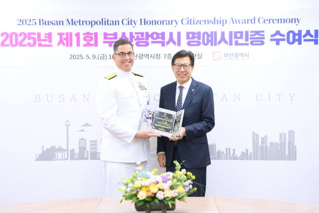 박형준 부산시장은 이날 오전 시청 국제의전실에서 닐 코프로스키 사령관에게 명예 시민증을 수여했다.