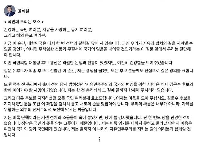◇ 김현정> 윤석열 전 대통령이 낙점했고 거기에 당권파가 합류하면서 한덕수 후보를 그렇게 끝까지 무리하게 좀 옹립하려고 했던 거 아니냐라는 분석이신데 그런데 박 의원님, 김문수 후보로 정해진 다음에 윤석열 전 대통령이 SNS에다가 응원하고 지지하는 글을 올렸는데요.