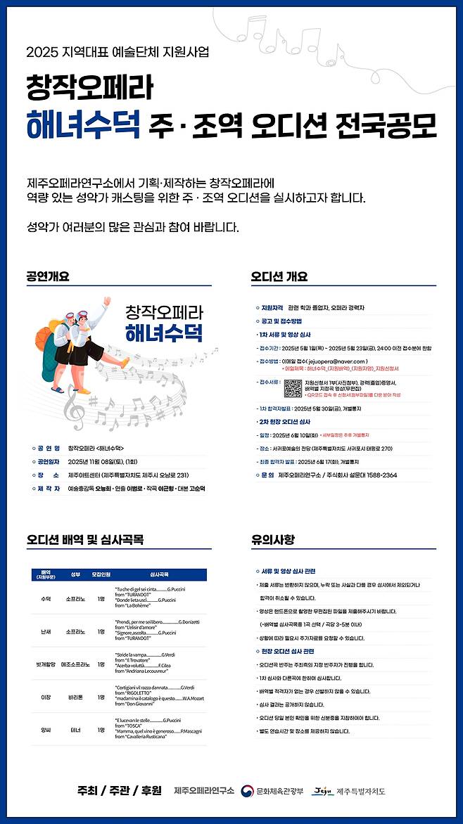 제주오페라연구소(이하 연구소)는 2025년 지역대표 예술단체 지원사업의 일환으로, 11월 창작오페라 '해녀수덕'을 11월 초연하면서 출연진을 전국 공모한다.
