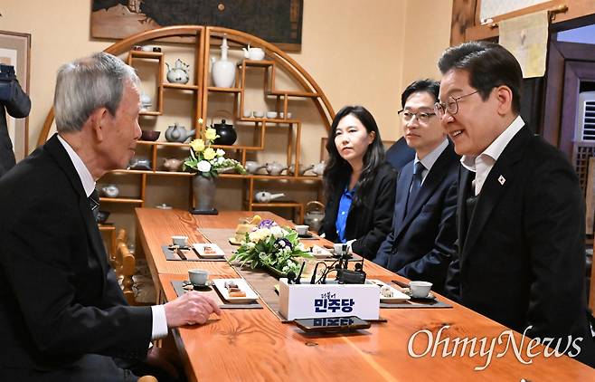 이 후보는 '골목골목 경청투어' 일정으로 이날 창녕·함안·의령에 이어 진주를 찾았다가 전통찻집 '죽향'에서 김장하 선생과 차담을 나눴다. 이 자리에는 경남도지사를 지낸 김경수 중앙선대위 총괄선대위원장(경남선대위 상임선대위원장 겸임), 대변인 강유정 국회의원 등이 동석했다.
