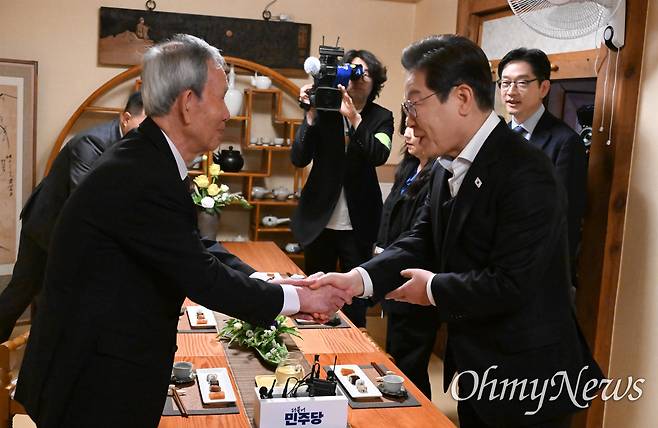 이어진 만남의 순간. 이재명 후보는 먼저 와 앉아 있던 김장하 선생을 보고 "선생님 일찍 오셨네요. 제가 먼저 와서 기다려야 하는데"라면서 "영상에서 뵌 얼굴과 똑 같습니다"라고 했다. 건강을 여쭌 이 후보는 문형배 전 대행과의 인연을 끄집어낸 뒤 "훌륭한 제자를 두셨습니다"라고 말했다.