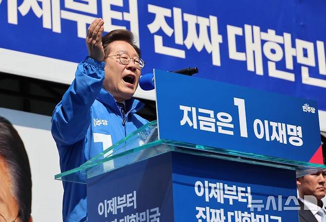 [서울=뉴시스] 조성우 기자 = 이재명 더불어민주당 대선후보가 제21대 대통령선거 공식 선거운동이 시작된 12일 오전 서울 청계광장에서 열린 중앙선거대책위원회 출정식에서 지지를 호소하고 있다. (공동취재) 2025.05.12. photo@newsis.com