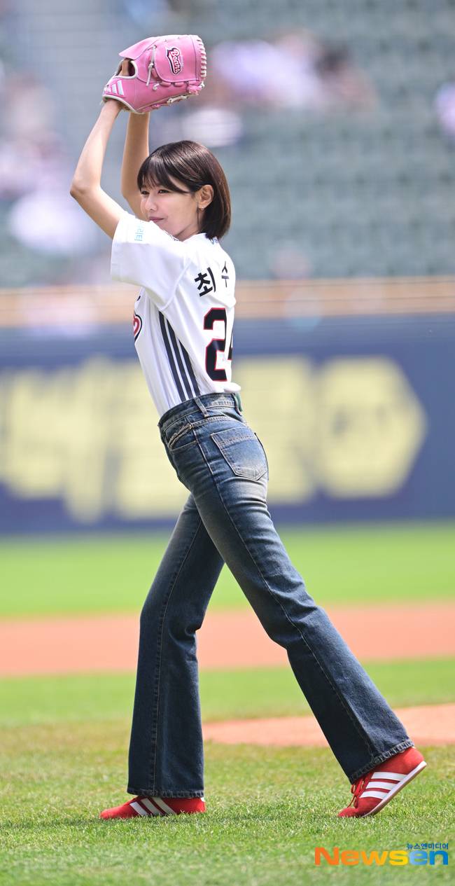 그룹 소녀시대 멤버 겸 배우 수영(최수영)이 아름다운 미모를 뽐내며 시구를 선보였다.