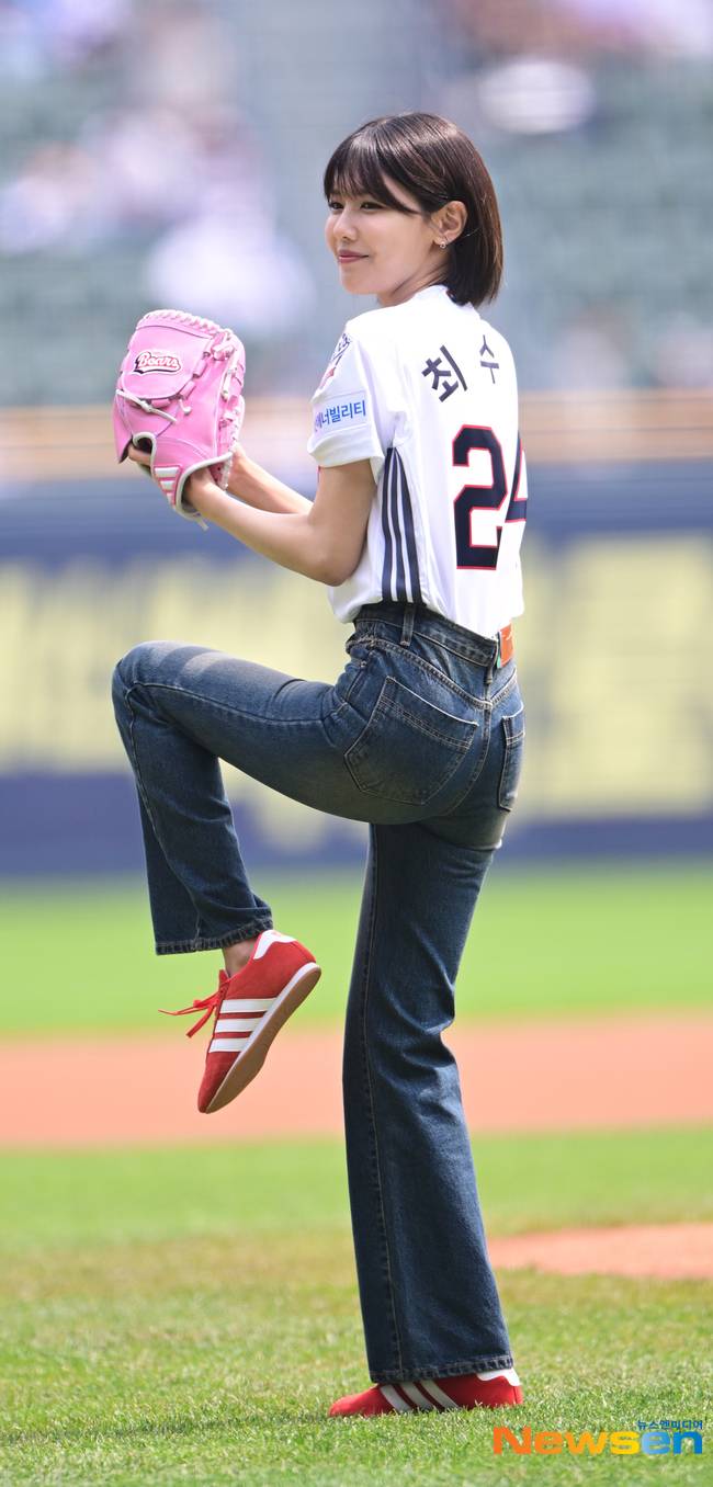 이날 시구자로 마운드를 밟은 수영은 하얀색 유니폼에 부츠컷 청바지, 빨간색 스니커즈를 착용하고 늘씬한 몸매를 뽐냈다. 특히 굽이 없는 운동화에 노출 없는 의상을 선택해 시구의 좋은 예로 등판했다.