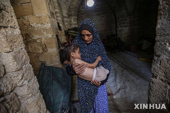 [가자시티=신화/뉴시스] 11일(현지 시간) 가자지구 가자시티의 한 피란민 대피소에서 팔레스타인 여성이 영양실조를 앓고 있는 6세 딸을 안고 있다. 팔레스타인 보건 당국과 유엔 관계자들은 12일, 이스라엘의 봉쇄가 계속될 경우 가자지구의 보건 및 인도주의 상황이 더욱 악화할 것이라고 경고했다. 2025.05.12.