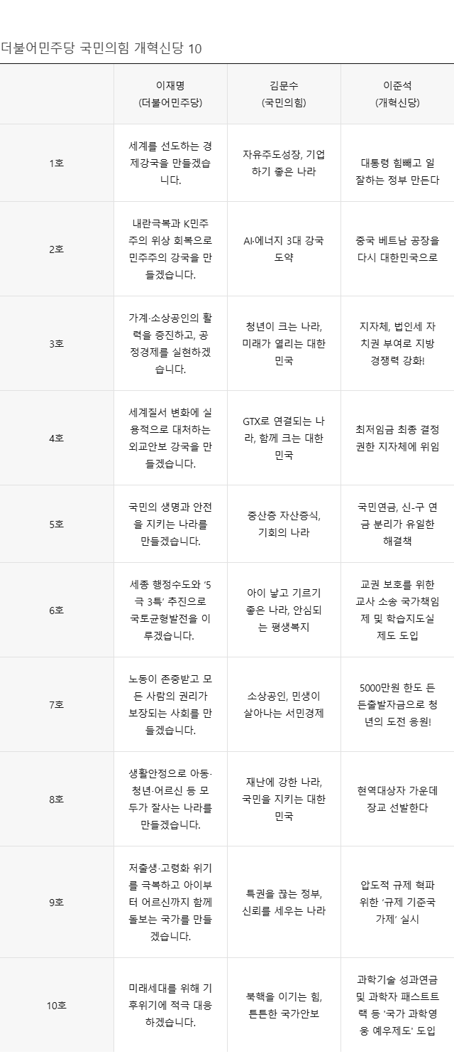 반면 이준석 개혁신당 대선 후보는 ‘부처 축소와 3부총리제’를 골자로 하는 ‘대통령 힘 빼고 일 잘하는 정부’를 10대 공약 중 정책순위 ‘1번’으로 제시했다.