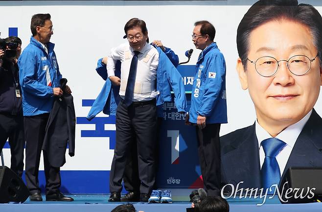 [오마이포토] '방탄복' 위에 선거운동복 입는 이재명 후보