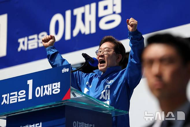 [서울=뉴시스] 조성우 기자 = 이재명 더불어민주당 대선후보가 제21대 대통령선거 공식 선거운동이 시작된 12일 오전 서울 종로구 광화문광장에서 열린 중앙선거대책위원회 출정식에서 연설을 하고 있다. 2025.05.12. xconfind@newsis.com