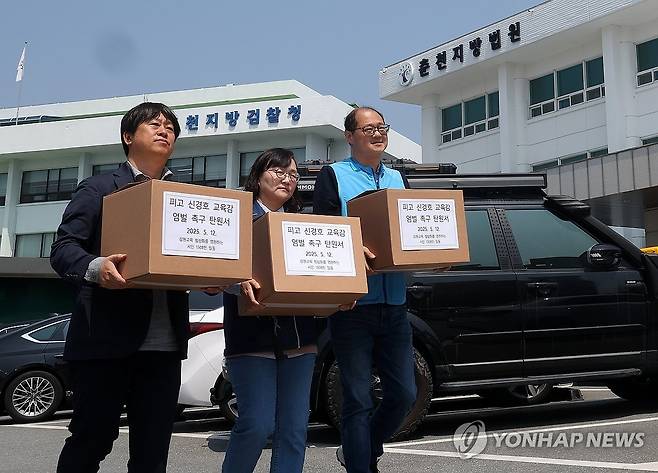 (춘천=연합뉴스) 양지웅 기자 = 12일 강원 춘천지방법원 앞에서 열린 '신경호 강원교육감 엄벌 촉구 시민 1천508명 탄원서 제출' 기자회견에서 최근순 참교육학부모회 강원지부 정책위원장(왼쪽부터)과 김수미 전국공무원노동조합 강원교육청지부장, 최고봉 전교조 강원지부장이 탄원서가 담긴 상자를 들고 법원 민원실로 향하고 있다.