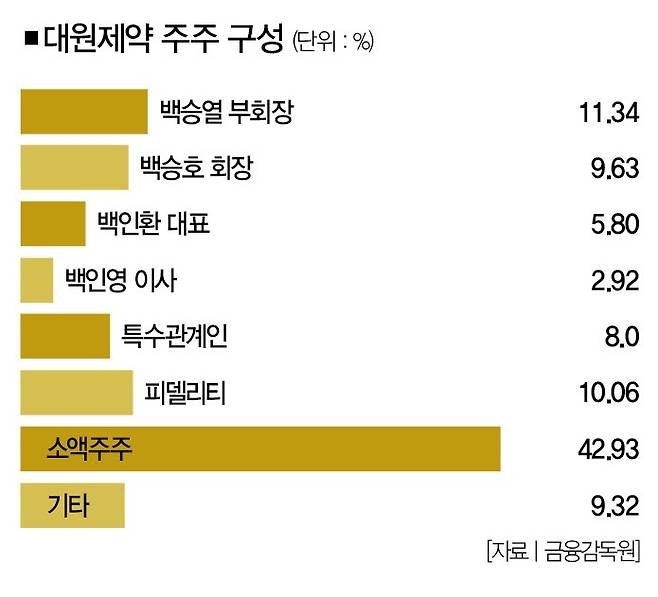 대원제약의 지분은 지난해 말 기준 백승호 회장과 백승열 부회장이 각각 9.63%, 11.34%를 보유하고 있다. 여기에 백인환(BAEK JONATHAN IN) 대표(지분 5.80%) 등 특수관계인의 지분은 16.72%였다. 오너 일가가 대원제약의 지분 37.69%를 보유하고 있다는 거다.