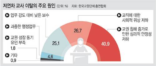 교원들은 저연차 교사들의 교직 이탈 원인에 대해 ‘교권 침해(40.9%)’를 1순위로 꼽았다. ‘사회적 인식 저하(26.7%)’ ‘업무 강도 대비 낮은 보수(25.1%)’도 뒤를 이었다. 본인이 교직을 정년까지 유지하지 않을 생각이라는 교사 중 54.8%도 ‘악성 민원, 생활지도 어려움 등 교권 하락’을 이유로 꼽았다.