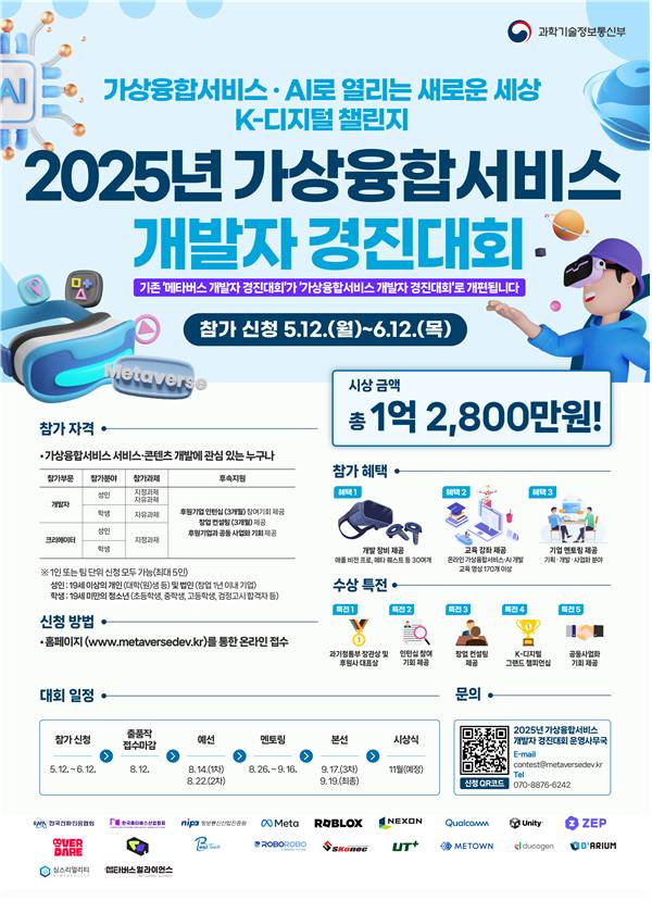 과학기술정보통신부는 한국전파진흥협회와 함께 한국 가상융합서비스 제작 저변 확대와 우수인재 발굴·육성을 위해 'K-디지털 챌린지 : 2025년 가상융합서비스 개발자 경진대회'를 이달 12일부터 개최한다.