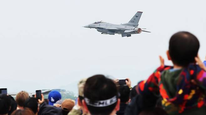 ▲ 11일 경기도 평택시 주한미공군 오산기지에서 열린 '오산 에어 파워 데이 2025'에서 미태평양공군 F-16 전투기가 특수비행을 선보이고 있다.