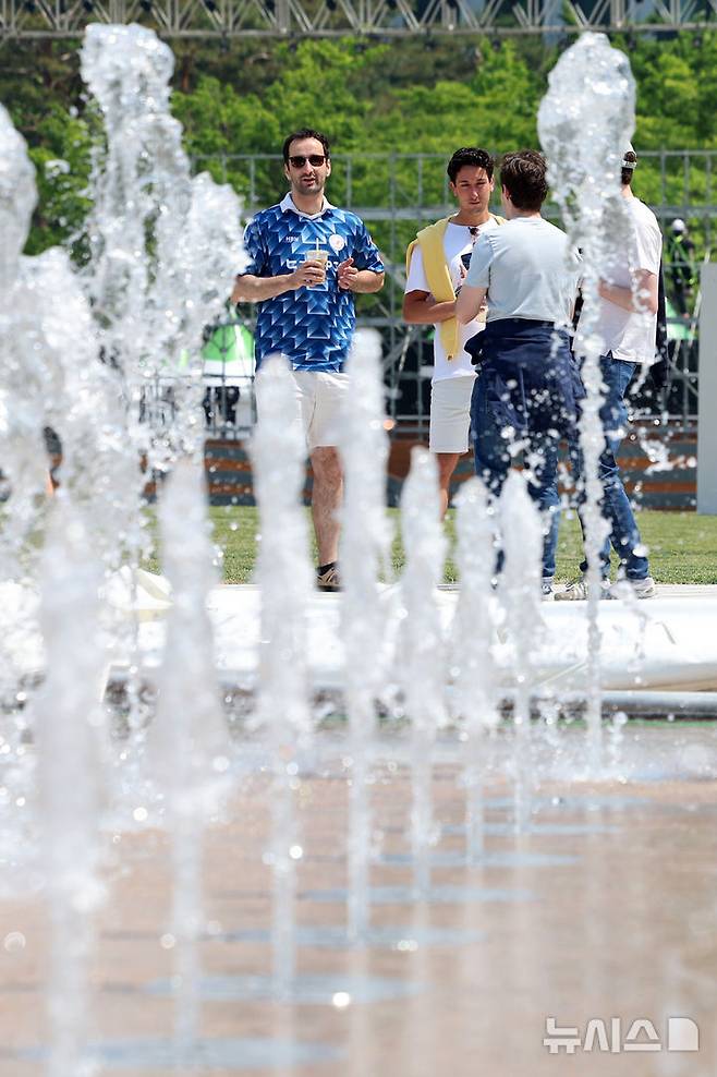 [서울=뉴시스] 이영환 기자 = 서울의 낮기온이 24도까지 오르며 초여름 날씨를 보인 12일 서울 중구 서울광장을 지나는 외국인들이 바닥분수를 바라보고 있다. 2025.05.12. 20hwan@newsis.com