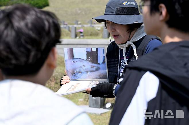 [광주=뉴시스] 김혜인 기자 = 광주 5·18민주화운동 45주년 엿새를 앞둔 12일 오전 광주 북구 국립 5·18민주묘지에서 학생들이 한강 작가의 '소년이 온다' 책 주인공 '동호' 실존 인물인 문재학 열사의 묘지를 참배하고 있다. 2025.05.12. hyein0342@newsis.com