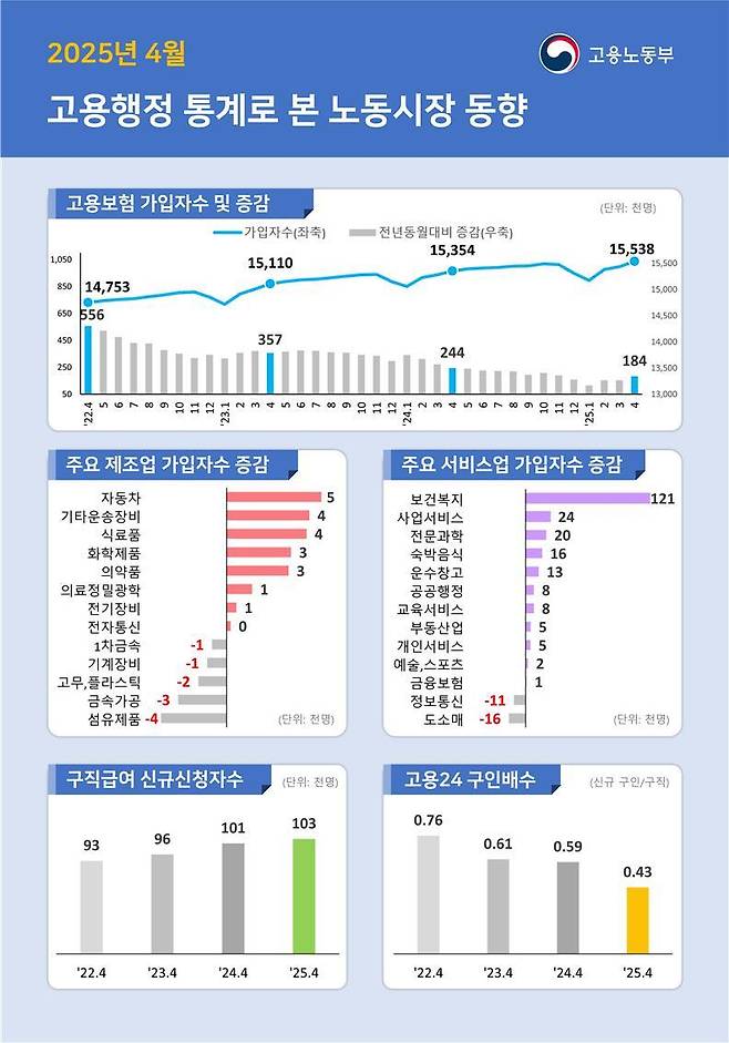 12일 고용노동부가 발표한 '2025년 4월 고용행정 통계로 본 노동시장 동향'에 따르면, 4월 고용보험 상시가입자 수는 1553만 8000명으로, 지난해 같은 달보다 18만 4000명(1.2%) 증가했다. 이는 최저였던 2020년 4월 16만 3000명 이후 5년 만에 가장 낮은 증가 폭이다.