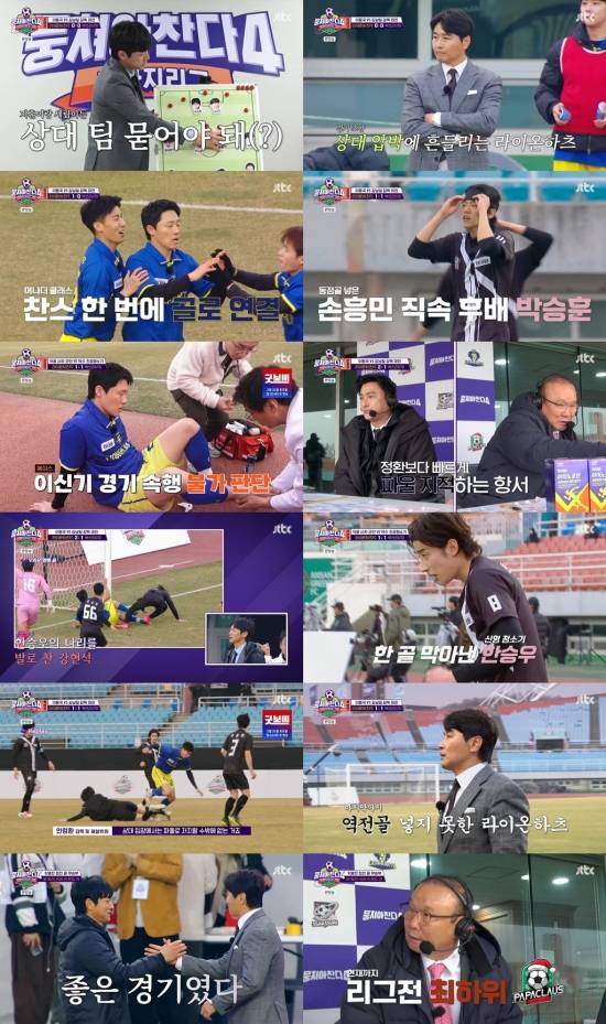 11일 방송된 JTBC 예능 ‘뭉쳐야 찬다4’(이하 ‘뭉찬4’) 6회에서는 김남일 감독의 ‘싹쓰리UTD’와 이동국 감독의 ‘FC라이온하츠’의 맞대결이 그려졌다. 수비의 팀 ‘싹쓰리UTD’와 공격의 팀 ‘FC라이온하츠’가 맞붙은 만큼, 창과 방패의 대결다운 명승부가 그려져 시청자들의 이목을 집중시켰다. 이에 이날 방송은 비지상파 채널 동 시간대 1위를 차지했다.