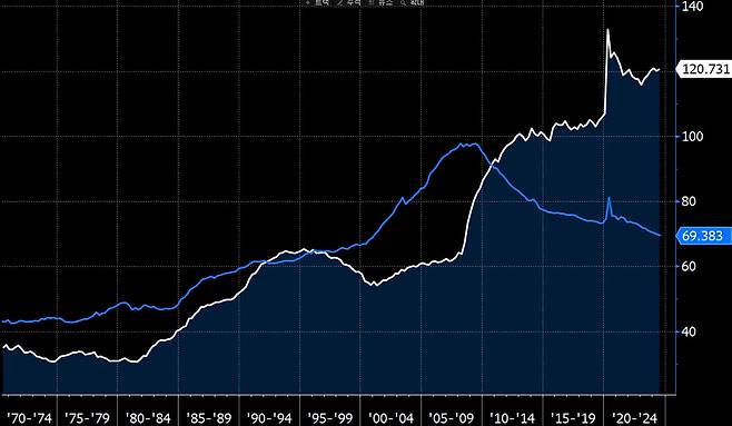 그리고, 아래는 미국의 공공부채비율% (흰색 현재 120%), 민간부채비율(파랑 현재 69%). 공공부채는 120%대로 상승하고, 민간부채는 서브프라임모기지 사태 이후 빠르게 감소하는 것이 보인다.