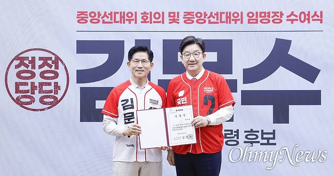 | ▲ 김문수 국민의힘 대선후보가 12일 서울 여의도 국민의힘 중앙당사에서 열린 중앙선거대책위원회 임명장 수여식에서 권성동 공동선대위원장에게 임명장 전달 후 기념촬영을 하고 있다. |