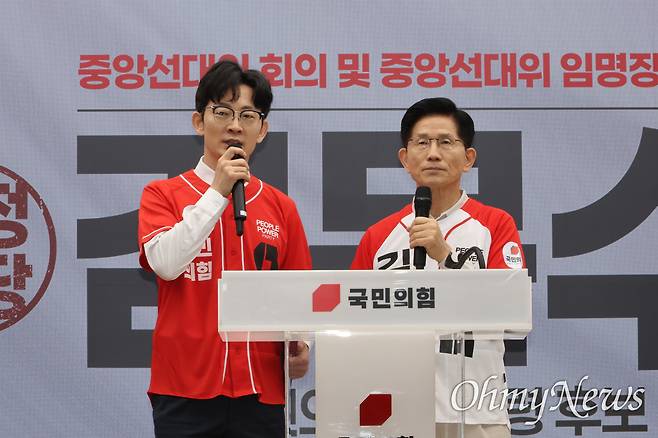 | ▲ 김문수 국민의힘 대선 후보가 12일 서울 여의도 중앙당사에서 열린 '중앙선거대책위원회 출범식 및 선대위원장 임명장 수여식'에서 박충권 의원과 함께 인사말을 하고 있다. |