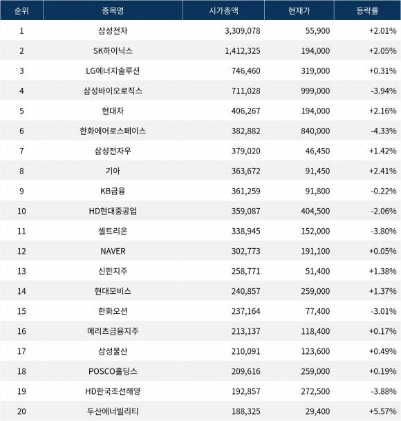 한국거래소에 따르면, 시가총액 1위 삼성전자(005930)는 현재가 55,900원으로 전 거래일 대비 2.01% 상승하고 있다.