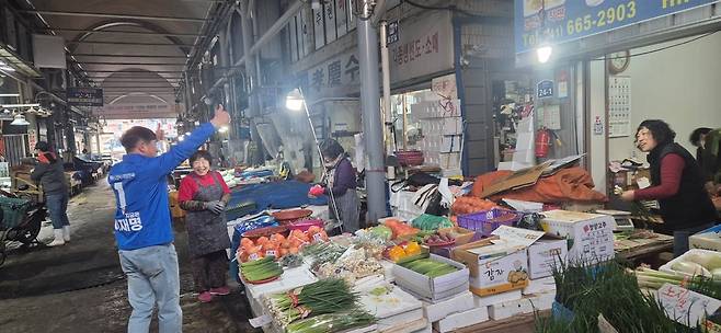 | ▲ 제21대 대통령선거 공식 선거운동 첫날인 12일 0시, 더불어민주당 조한기 서산·태안지역위원장은 서산 동부시장과 터미널, 호수공원을 차례로 돌며 새벽을 여는 시민들에게 인사를 전하는 것으로 첫 일정을 시작했다. |