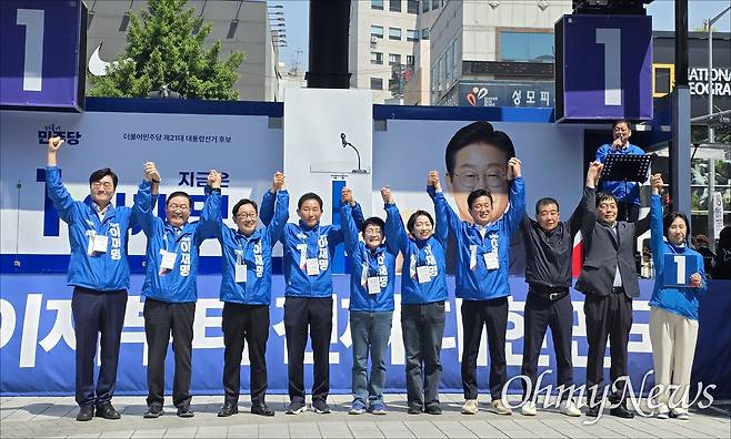 박범계 공동선대위원장도 "우리는 하마터면 후보 없이 대선을 치를 뻔했다. 윤석열의 내란은 한덕수의 내란으로 이어지고, 대법원의 내란으로 이어졌다. 그리고 여전히 내란은 끝나지 않았다"며 "내란을 끝내고 죽어가는 대한민국의 민주주의와 민생을 살리기 위해서는 반드시 이재명과 민주당이 승리해야 한다. 그 승리의 시작을 대전에서부터 만들어내자"고 호소했다.