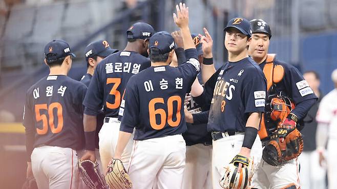 ▲ 11일 서울 고척스카이돔에서 열린 프로야구 한화 이글스와 키움 히어로즈의 경기에서 8-0으로 승리한 한화 선수들이 기뻐하고 있다.