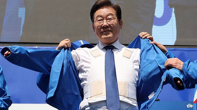▲ 더불어민주당 이재명 대선 후보가 6·3 대통령선거 공식 선거운동 첫날인 12일 서울 광화문 청계광장에서 열린 중앙선대위 출정식 및 첫 유세에서 방탄복 위에 선대위 점퍼를 입고 있다.