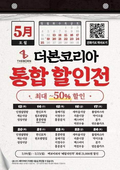 13일부터 24일까지는 오프라인 할인전을 엽니다. 새마을식당, 홍콩반점, 한신포차, 연돈볼카츠 등 매일 다른 브랜드의 대표 메뉴가 최대 50% 할인된 가격으로 판매됩니다. 구체적인 일정은 ▲5월 13일·20일(화) 인생설렁탕, 제순식당, 성성식당 ▲5월 14일·21일(수) 한신포차, 원조쌈밥집 ▲5월 15일·22일(목) 돌배기집, 홍콩분식, 미정국수 ▲5월 16일·23일(금) 역전우동, 리춘시장, 새마을식당, 백스비어 ▲5월 17일·24일(토) 연돈볼카츠, 롤링파스타, 본가, 막이오름 ▲5월 22일(목) 홍콩반점 등입니다.