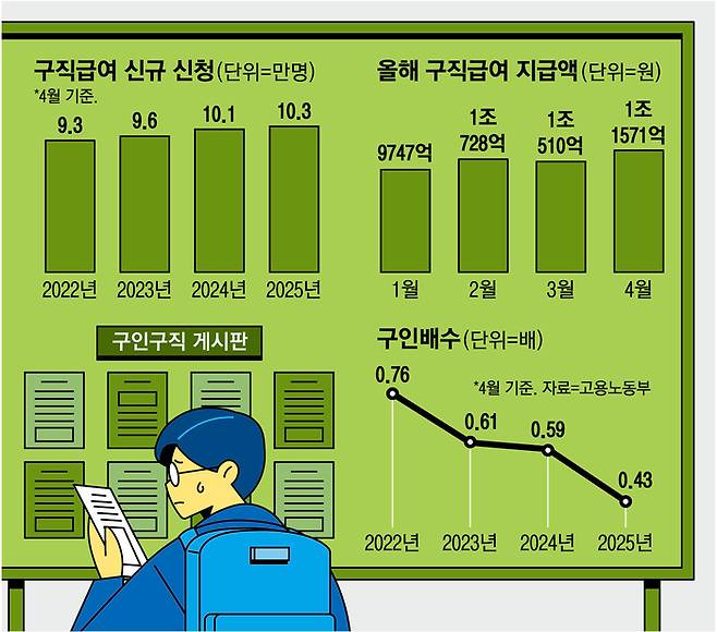 구인배수가 0.5보다 낮다는 것은 일자리 1개를 놓고 2명 이상의 구직자가 경쟁하고 있다는 뜻이다. 구인배수는 4월 기준 2022년 0.76, 2023년 0.61, 지난해 0.59 등으로 감소세를 보이고 있다.