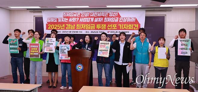 | ▲ 민주노총 경남본부, 경남여성연대, 경남청년유니온은 5월 12일 경남도청 프레스센터에서 ‘최저임금 투쟁’을 선언했다. |