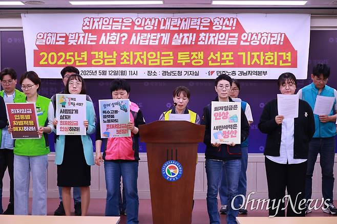 민주노총 경남본부, 경남여성연대, 경남청년유니온은 회견문을 통해 "최저임금위원회에서 발표하는 '비혼 단신 노동자 실태생계비 분석보고서'에 따르면 2023년 단신노동자 생계비는 월평균 245만9769원이다"라며 "2024년 경제성장률과 물가상승률 등을 반영하면 2025년 생계비는 250만 원을 훌쩍 넘길 것이란 것을 쉽게 알 수 있다. 그러나 2025년 최저임금은 월급 209만6270원이다. 노동을 해도 적자 인생이다. 바꿔야 한다"라고 했다.