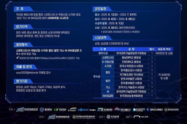 시상은 8개 분야 전체 최고상에 KISTI원장상과 상금 500만 원, 분야별 우수상 10팀에 각각 주최 기관장상과 상금 300만 원을 수여한다. 시상식은 오는 9월 30일 대전컨벤션센터(DCC)에서 열리는 '2025 충청 사이버보안 콘퍼런스'에서 열릴 예정이다.