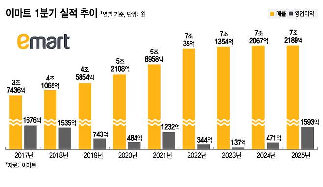 증권가에선 1분기 이마트 영업이익을 1250억원 안팎으로 예측했는데, 실제 이익 규모는 이보다 25% 이상 많았다. 1분기 실적 기준으론 2017년 1분기(1676억원) 이후 8년 만에 최대 실적을 냈다.