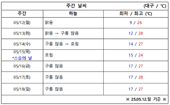 5월 2주 차 아침 기온 9도에서 17도, 낮 기온 24도에서 28도 예상됩니다.