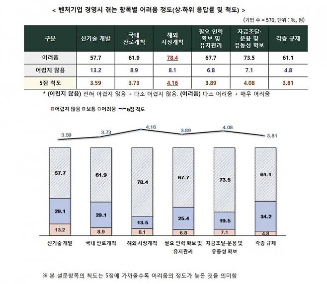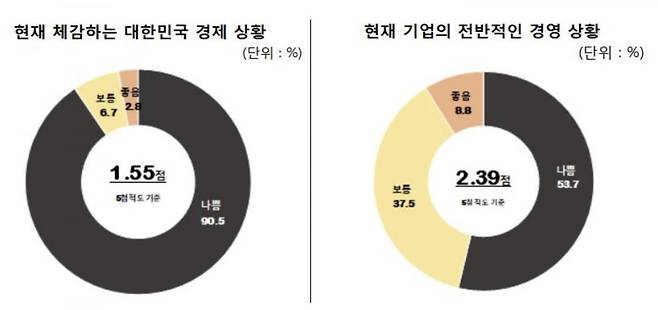 한편 현재 대한민국 경제 상황에 대해서는 90.5%가 '나쁨'이라고 응답했다. 현재 기업의 전반적인 경영 상황도 절반 이상인 53.7%가 부정적으로 평가했다. 특히 '해외 시장 개척'에 어려움을 느끼고 있다고 응답한 기업이 78.4%로 가장 높았다.