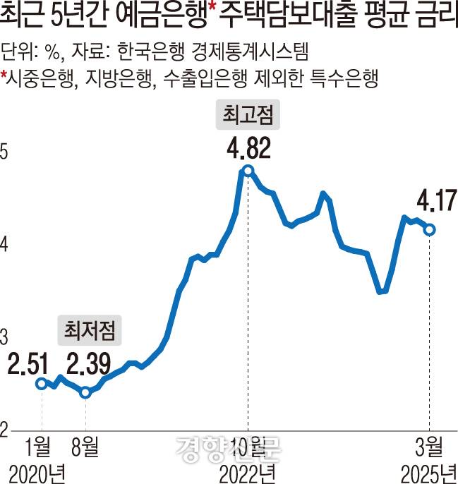 문제는 당시 주담대 금리는 2%였으나 현재는 4~5%대에 육박한다는 데 있다. 한국은행 경제통계시스템을 보면 올해 1~3월 예금은행 주택담보대출금리(신규취급액 기준)는 평균 4.22%(4.17~4.27%)로 2020년 1~3월 평균 2.5%(2.48~2.52%)보다 1.72%포인트 올랐다.