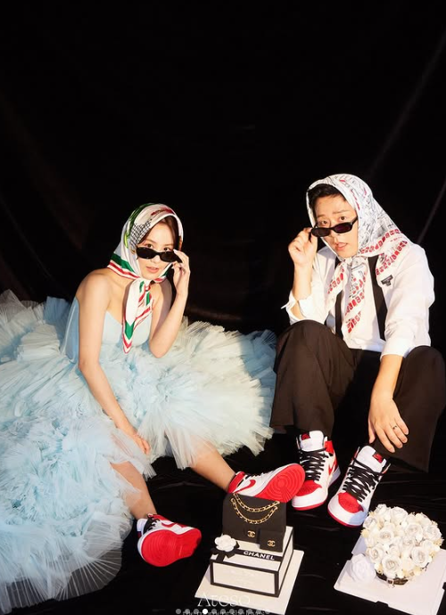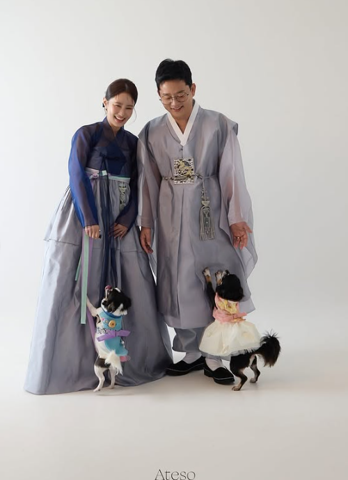 김지민과 김준호는 각각 드레스와 슈트를 입은 '정석' 화보는 물론, 머리에 스카프를 두르고 선글라스를 낀 재미있는 컨셉, 한복을 입고 반려견들과 함께한 컨셉, 빈티지 컨셉, 찰리 채플린을 따라 한 모습까지 다양한 컨셉의 화보를 공개했다