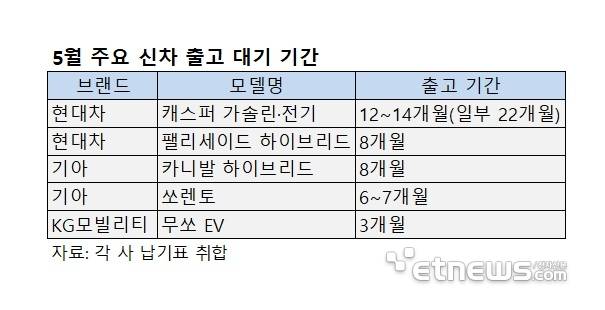 이달 현대차 '캐스퍼'를 계약하면 출고까지 최소 1년 이상, 현대차 '팰리세이드'와 기아 '카니발' 하이브리드는 각각 8개월 이상이 소요된다.