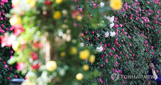 (대구=연합뉴스) 윤관식 기자 = 12일 대구 달서구 이곡장미공원에서 한 시민이 활짝 핀 장미를 휴대전화로 촬영하고 있다. 2025.5.12