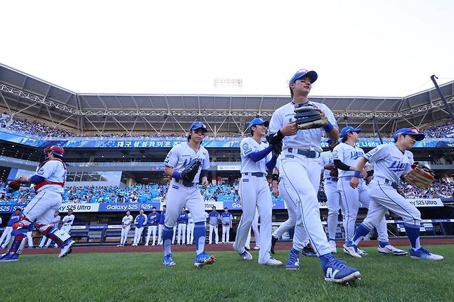지난 26일 대구 삼성라이온즈파크에서 열린 '2025 신한 SOL 뱅크 KBO리그' 삼성 라이온즈와 NC 다이노스전에서 삼성 선수단 모습. <삼성 라이온즈 제공>