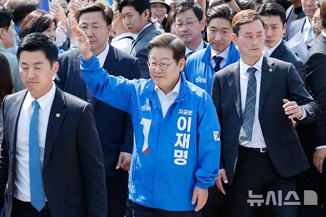 [화성=뉴시스] 조성우 기자 = 이재명 더불어민주당 대선후보가 제21대 대통령선거 공식 선거운동이 시작된 12일 경기 화성시 동탄 센트럴파크 음악분수중앙광장에서 열린 집중유세 입장하고 있다. (공동취재) 2025.05.12. photo@newsis.com